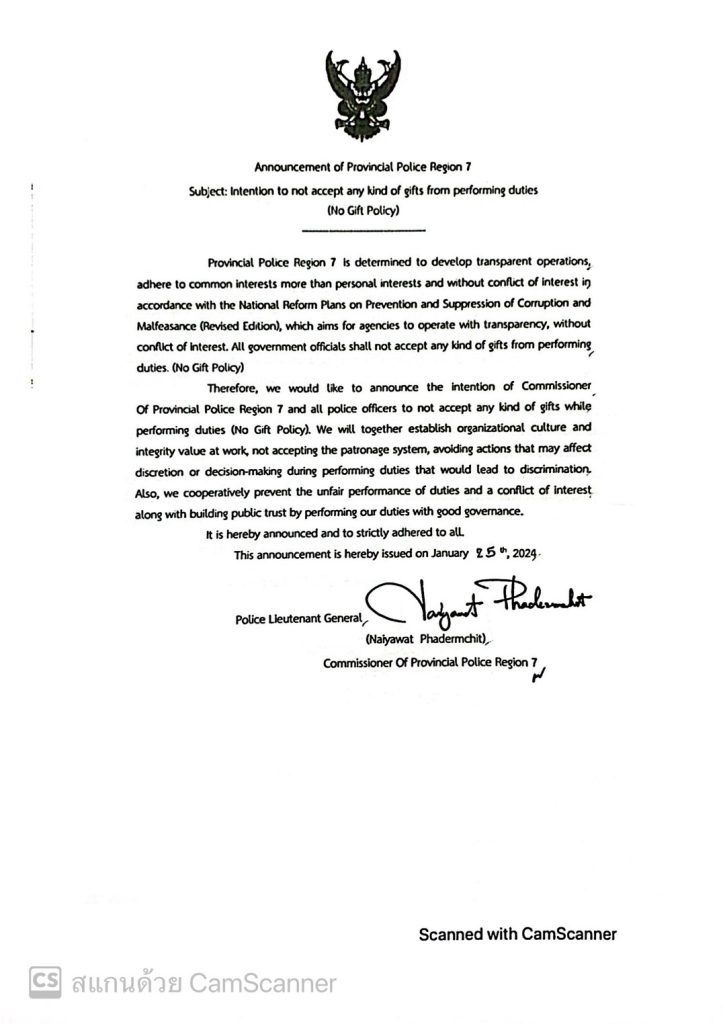 ตำรวจภูธรภาค 7 แสดงเจตนารมณ์ที่จะไม่รับของขวัญและของกำนัลทุกชนิดจากการปฏิบัติหน้าที่