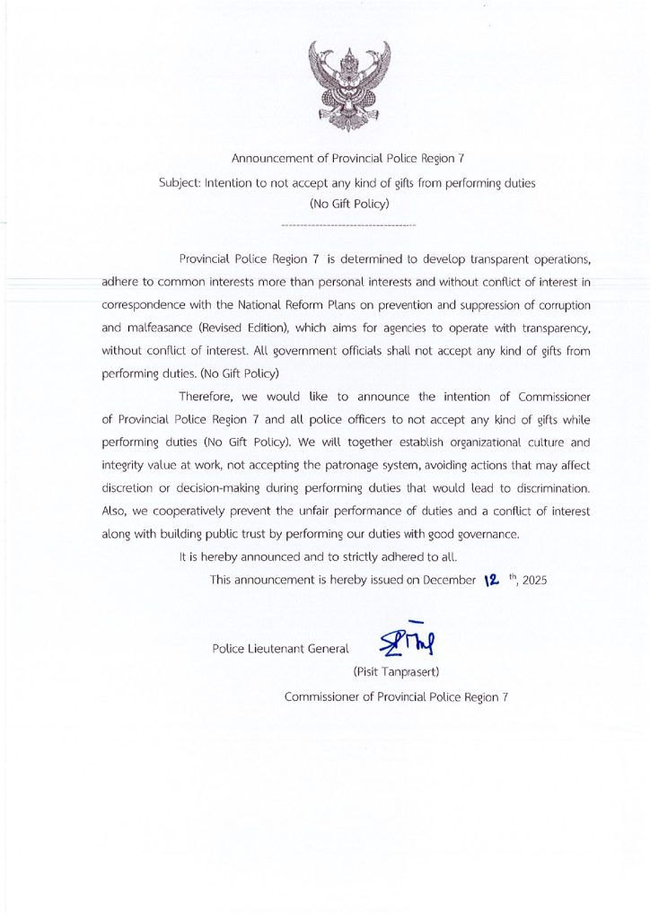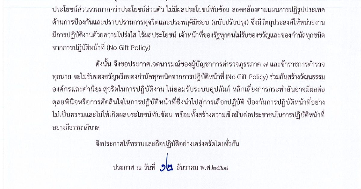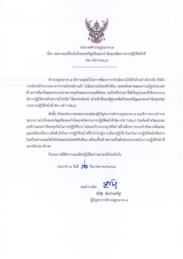 ประกาศตำรวจภูธรภาค 7 เรื่อง เจตนารมณ์ที่จะไม่รับของขวัญหรือของกำนัลทุกชนิดจากการปฏิบัติหน้าที่ ( No Gift Policy)
