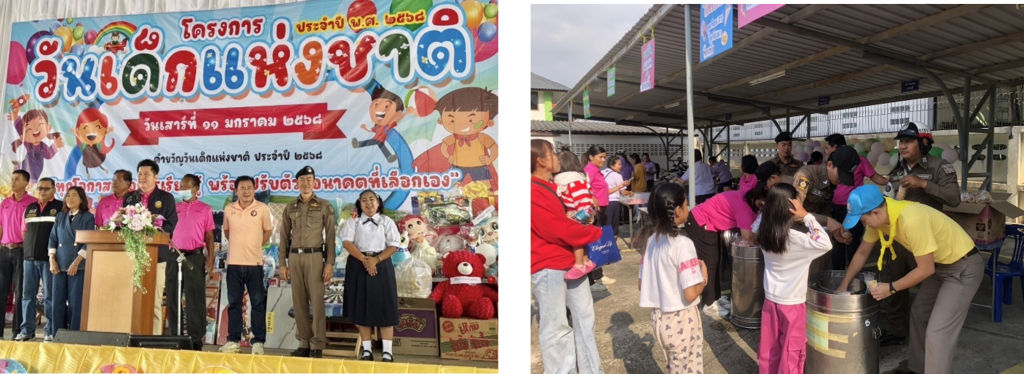 รายละเอียดกิจกรรม (ใคร /ทำอะไร /ที่ไหน/เมื่อไร /เพื่ออะไร /ทำอย่างไร/ผู้เข้าร่วมกิจกรรมจำนวนเท่าใด แยกแยะ ตำรวจ ข้าราชการอื่น และประชาชน) พ.ต.อ.อัธธ์ยา แถบทอง ผกก.สภ.กรับใหญ่ มอบหมายให้ พ.ต.ท.ภาณุพงศ์ วัฒนพร รอง ผกก.ป.สภ.กรับใหญ่ พร้อมข้าราชการตำรวจชุดจิตอาสา สภ.กรับใหญ่ รวม 10 นาย ดำเนินกิจกรรมจิตอาสาพัฒนา อำนวยความสะดวกการจราจร รักษาความปลอดภัย และแจกไอศกรีมให้แก่เด็กและผู้ปกครองที่มาร่วมกิจกรรม เนื่องในวันเด็กแห่งชาติ พ.ศ.2568