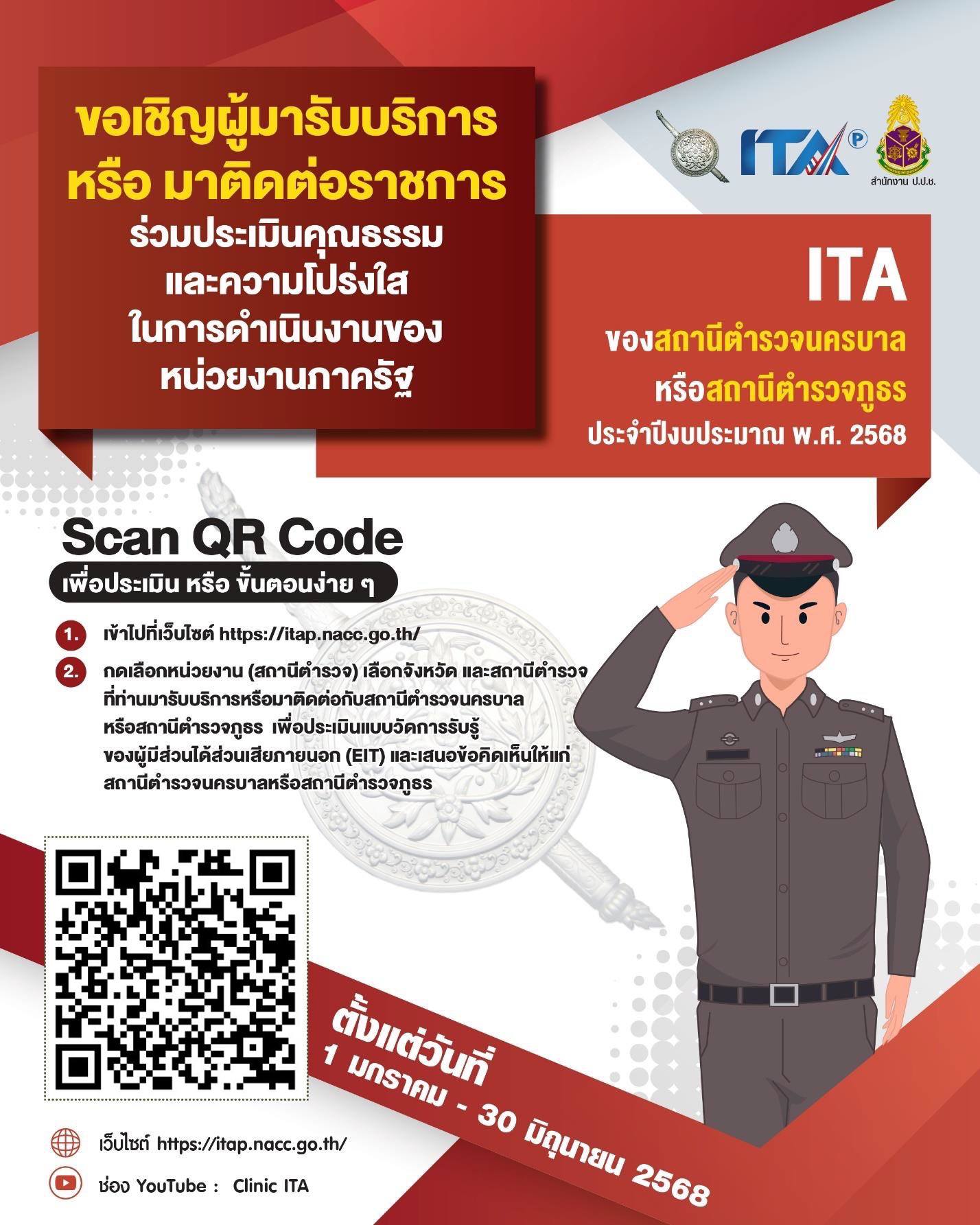 เชิญผู้มารับบริการหรือมาติดต่อราชการร่วมประเมินคุณธรรมและความโปร่งใสในการดำเนินงานของหน่วยงานภาครัฐ (Integrity and Transparency Assessment : ITA) ประจำปีงบประมาณ พ.ศ. 2568 ของสถานีตำรวจภูธรกรับใหญ่ ประจำปีงบประมาณ พ.ศ. 2568