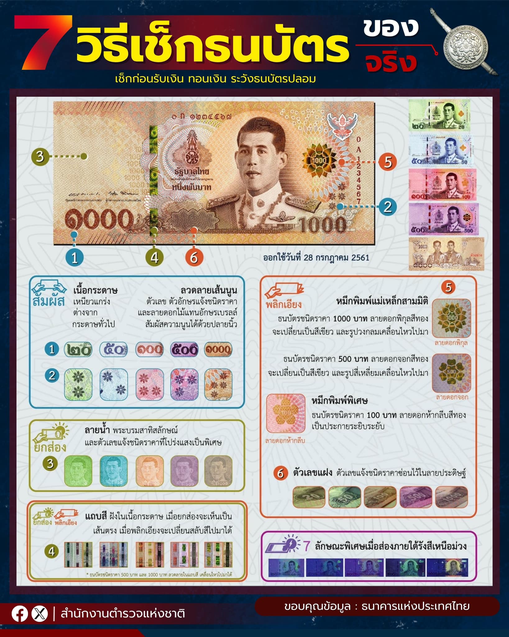 รู้ไว้ ไม่ตกเป็นเหยื่อมิจฉาชีพ #เช็กก่อน ได้รับเงิน ทอนเงิน ดูให้ดีแบงก์จริง หรือปลอม สำนักงานตำรวจ
