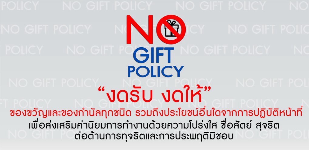 ไม่รับของขวัญและของกำนัลทุกชนิด จากการปฏิบัติหน้าที่ (No Gift Policy) ทั้งในขณะ ก่อน และหลังปฏิบัติหน้าที่